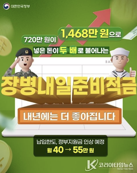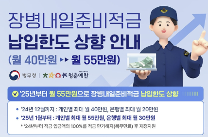 - 2025년부터 장병내일준비적금의 월 납입 한도는 기존 40만 원에서 55만 원으로 상향되었습니다. 다만, 은행별로 납입할 수 있는 금액이 정해져 있으므로 이를 반드시 확인해야 합니다.
