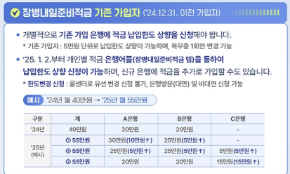 - 2025년 1월 2일부터 각 은행의 어플리케이션(장병내일준비적금 탭)에서 한도 상향 신청 가능