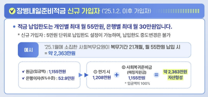 - 강제 저축 효과: 자동이체를 통해 복무 기간 동안 꾸준히 저축 가능.