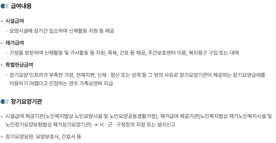 - 혜택: 재가 요양 서비스(방문 요양, 목욕) 제공, 시설 입소 가능
