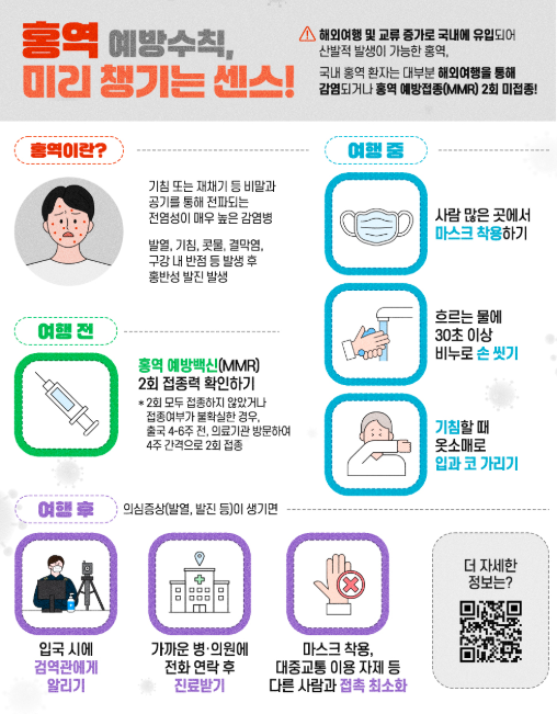 홍역은 매우 전염성이 강한 바이러스성 질환으로, 면역력이 부족한 사람에게 쉽게 퍼질 수 있습니다. 이를 예방하기 위한 가장 중요한 방법은 예방접종입니다. 한국에서는 MMR 백신(홍역, 볼거리, 풍진을 예방하는 백신)을 통해 홍역을 예방하며, 접종 시기는 정해져 있습니다.